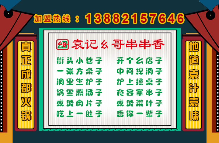 袁记幺哥串串香;袁记幺哥串串香在承袭麻、辣、鲜、香传统口味的同时,结合中医药养生原理,解决传统火锅易上火、肠胃不适、喉管干涩等问题,开创出美味健康的底料和特色干碟。此外,结合成都食客口味,将两地美食精华融汇一身,匠心独具地推出腰片、脆肚、龙须、君把、嫩牛肉等特色菜品,并由服务员为客户亲手烫制,保证菜品口味地道正宗。袁记幺哥串串香这两大创举,将传统的灌洲美食以崭新的面貌,展示在追求美食享受的消费者面前,使流传千年的巴蜀美食文化得以传承、发展、弘扬